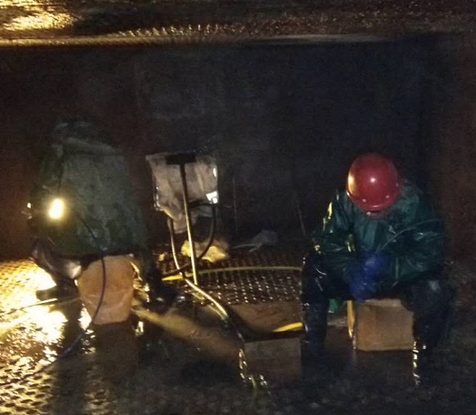 因2#鍋爐上下級(jí)空預(yù)器堵塞嚴(yán)重,無(wú)法滿足生產(chǎn)負(fù)荷要求,影響鍋爐正常運(yùn)行,2019年1月14日9點(diǎn)30分,根據(jù)公司停車檢修計(jì)劃,對(duì)2#鍋爐空預(yù)器管進(jìn)行清洗及疏通,首先在煙道底部制作排水口,引至地溝,保證現(xiàn)場(chǎng)路面無(wú)積水及結(jié)冰,待空預(yù)器內(nèi)溫度下降,公司領(lǐng)導(dǎo)組織崗位人員輪流進(jìn)入空預(yù)器清理積灰,為空預(yù)器管道清洗及疏通做好各項(xiàng)準(zhǔn)備工作,15日正式使用清洗機(jī)對(duì)空預(yù)器進(jìn)行帶壓清洗,所有人員不怕苦、不怕累、放棄休息時(shí)間協(xié)助外包人員及時(shí)疏通空預(yù)器堵塞管道,更換空預(yù)器套管,檢修人員雖然穿著厚厚的棉衣,但不一會(huì)也被寒冷打透。手凍僵了,他們搓了搓接著干。