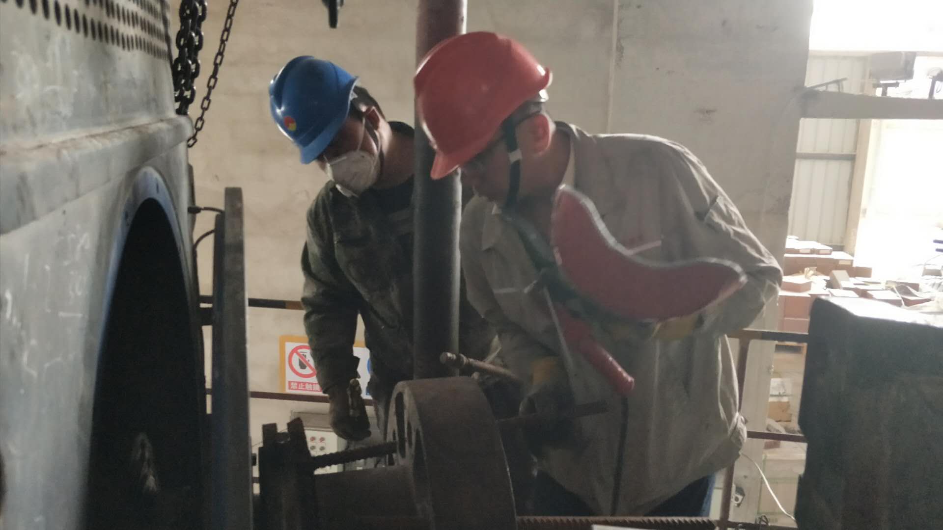 5月27日,檢修人員頂著大風(fēng)降溫,加班加點完成烘干破主電機和生料磨輥壓機側(cè)擋板檢修。