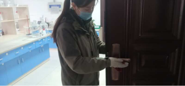 擦拭操作臺、門把手,工作的有條不紊。