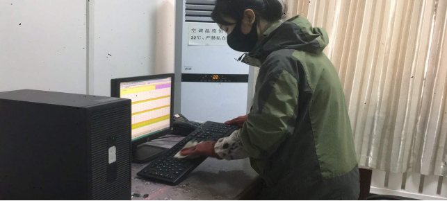 擦拭操作臺(tái)、門(mén)把手,工作的有條不紊。