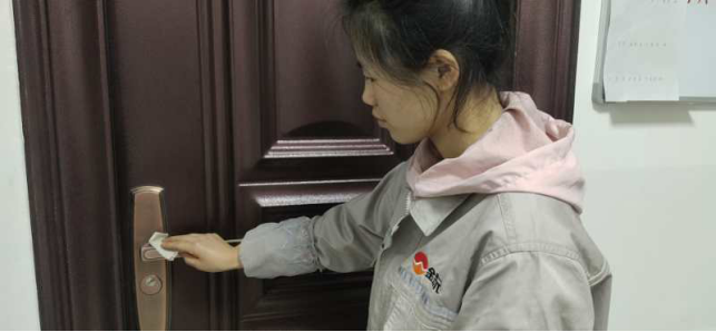 擦拭操作臺、門把手,工作的有條不紊。
