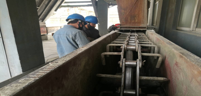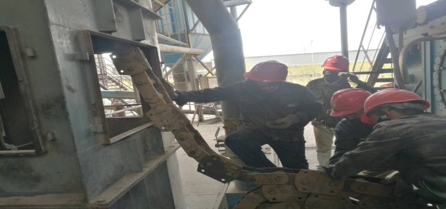 在窯頭收塵器拉鏈機,他們及時拆卸拉鏈進行更換,校正拉鏈平衡度。整個過程緊張有序,忙而不亂。無論是公司領導還是一線職工,大家都全身心投入到檢修戰(zhàn)役中。