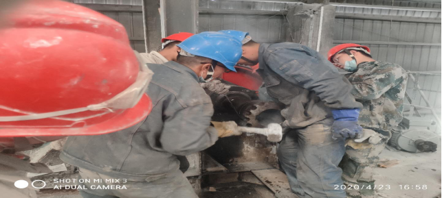 (6)烘干破減速機(jī)齒輪及軸承檢查,更換油封,聯(lián)軸器找正。破碎機(jī)內(nèi)部襯板檢查并緊固螺栓,破碎機(jī)內(nèi)雜物清理(未完成);