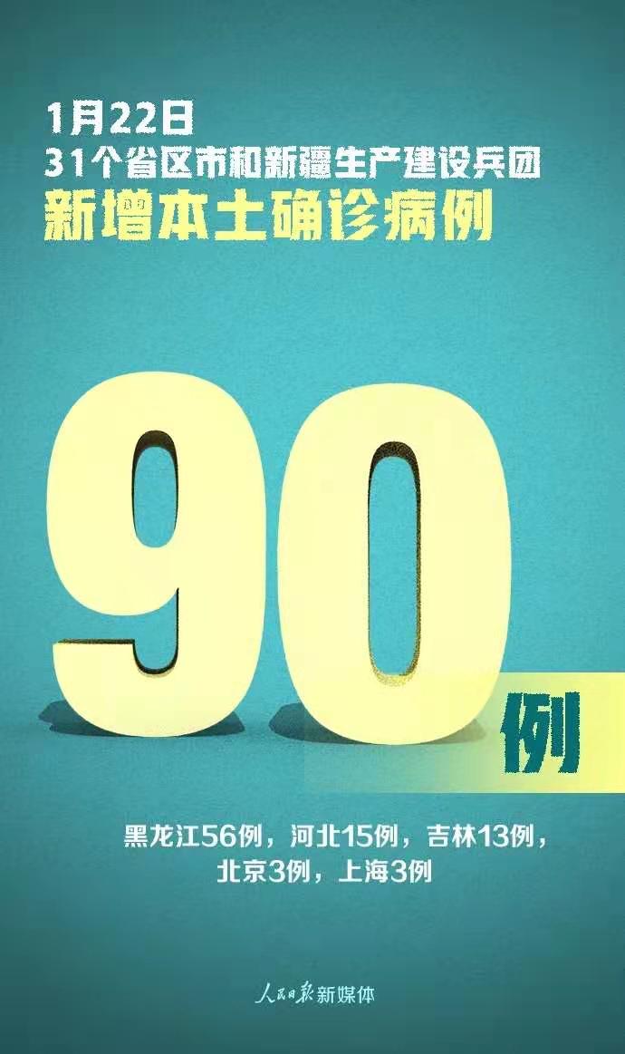 1月22日0—24時,31個。ㄗ灾螀^(qū)、直轄市)和新疆生產(chǎn)建設(shè)兵團報告新增確診病例107例,其中境外輸入病例17例(上海8例,山西4例,江蘇2例,湖南1例,廣東1例,四川1例),本土病例90例(黑龍江56例,河北15例,吉林13例,北京3例,上海3例);無新增死亡病例;新增疑似病例2例,其中境外輸入病例1例(在上海),本土病例1例(在上海)。