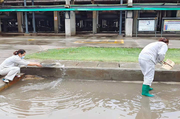 無論刮風(fēng)還是下雨,天氣有多惡劣 ,總有一群人,她們始終是堅(jiān)守在崗位一線的最美員工,那就是從事質(zhì)檢分析的女工們。其實(shí)在四班三倒的日子里,她們最頭疼的不是工作忙,而是遇見雨雪天氣,特別是下雨天時(shí),出門去現(xiàn)場取樣就變得困難了很多,有時(shí)候?yàn)榱巳臃奖,她們寧愿選擇不打傘、不穿雨衣,一趟下來,衣服和鞋子差不多全濕透了。這不,那一晚她們就迎來了一夜的雨,從小雨逐漸變成中雨,聽著外面的雨聲,她們?nèi)缱槡,萬一變成暴雨可怎么辦,雨一直不停又怎么辦,外面的雨已經(jīng)越下越大,但到了取樣時(shí)間她們不畏困難做好防護(hù)準(zhǔn)時(shí)到現(xiàn)場取樣,她們堅(jiān)信遇到再大困難也要戰(zhàn)勝困難,去完成自己的工作。終于等到了天亮,雨也停了下來,等待她們的就是清理積水?粗敲匆淮笃e水,沒有抽水泵,這讓她們犯起了難,思考了片刻,她們決定用最老土的辦法使用水桶、笤帚、簸箕清理積水,說干就干,水比較深,只好換上了雨鞋,大家分工明確,掃地掃,鏟地鏟,提得提,倒得倒,一會(huì)的功夫積水已經(jīng)少了很多,在大家緊密的配合下,最終把坑里積水全部清理了出去。
