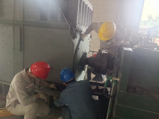 在熱火朝天的檢修現(xiàn)場,成品裝置、電儀裝置密切配合,從安全交底、檢修分工到拆解電機(jī)軸套,再到裝車、指揮、起吊……你來我往,緊張而有序。對于他們來說這種工作雖早已輕車熟路,但由于烘干破主電機(jī)是公司關(guān)鍵設(shè)備,主電機(jī)更換過程中面臨電機(jī)基礎(chǔ)尺寸不一致、轉(zhuǎn)子中心有偏差等問題,加上時間緊迫等因素,工作難度較以往困難許多。為了將電機(jī)更快完成更換搶修,及時找正,他們彎腰跪地、爬高走低,裝置負(fù)責(zé)人與全體參戰(zhàn)工人齊上陣,安全員、技術(shù)員現(xiàn)場加強(qiáng)安全監(jiān)管和技術(shù)支撐,公司領(lǐng)導(dǎo)全程監(jiān)護(hù)指導(dǎo)。