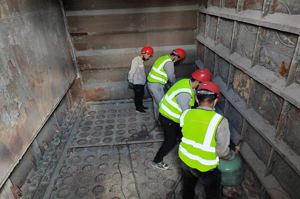脫硫塔檢修現(xiàn)場(chǎng),塔內(nèi)料液堆積多,空間小,清理難度大,只能用小推車一車一車的拉運(yùn)到人孔門,再一鍬一鍬的鏟上鏟車,工作量非常大,只有熱力裝置的人很難在檢修時(shí)間內(nèi)完成料液清理工作。公司總經(jīng)理、副經(jīng)理守在現(xiàn)場(chǎng),協(xié)調(diào)各科室、裝置人員協(xié)助清理,兩天兩夜沒有間斷,在滿是泥水的脫硫塔內(nèi)來來回,奔跑了無數(shù)次,污泥沾滿了全身每一個(gè)地方,不知是汗水還是泥水浸濕了衣服,他們干活不分你我,不惜力氣,相互配合,安全高效的完成了料液清理工作,為下一步脫硫塔消漏、防腐做好鋪墊。