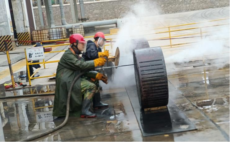 檢修已經(jīng)是第三天,接近尾聲,大家似乎已經(jīng)疲憊,但是行動(dòng)上未松懈。今日的氯化氫小廣場上格外熱鬧,7:20,班長已經(jīng)開始準(zhǔn)備今日的檢修票證,為檢修項(xiàng)目做準(zhǔn)備。他的身影在朝陽地映射下顯得那么著急,沒有一點(diǎn)怠慢的意思,今天我們班組檢修的項(xiàng)目是提濃塔再沸器石墨塊疏通工作,這項(xiàng)工作看起來簡單,實(shí)際上是耐心地考驗(yàn)。一個(gè)個(gè)細(xì)小的石墨孔需要用蒸汽一個(gè)一個(gè)疏通,檢修開始之前還是和往常一樣,安全教育是少不了的,班長一遍遍強(qiáng)調(diào)防護(hù)用品規(guī)范佩戴以及疏通過程中的安全注意事項(xiàng),在準(zhǔn)備工作結(jié)束后,今天的檢修工作開始了。