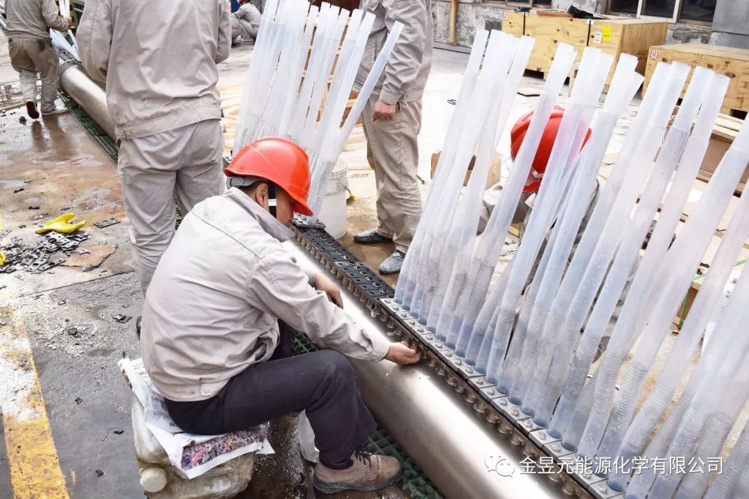 氯乙烯裝置檢修現(xiàn)場(chǎng),檢修人員正四、五人一組,齊心協(xié)力的給除霧器濾筒裹上厚厚的“棉衣”,為檢修VI轉(zhuǎn)化除霧器做好準(zhǔn)備工作。