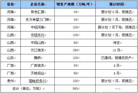 表1 2019年國內(nèi)氧化鋁增復(fù)產(chǎn)統(tǒng)計(數(shù)據(jù)來源:東證期貨)
