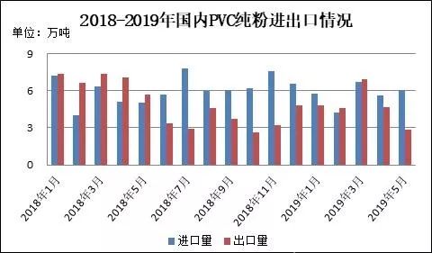 圖5 2018-2019年國(guó)內(nèi)PVC純粉進(jìn)出口情況