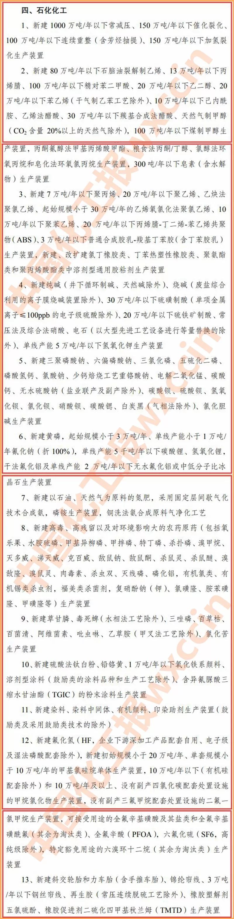 石化化工行業(yè)限制類有13大類,包括:新建 1000 萬噸/年以下常減壓裝置;新建80萬噸/年以下石腦油裂解制乙烯、13萬噸/年以下丙烯腈、100萬噸/年以下精對苯二甲酸、20 萬噸/年以下乙二醇、20 萬噸/年以下苯乙烯(干氣制乙苯工藝除外);新建純堿(井下循環(huán)制堿、天然堿除外)、燒堿、30 萬噸/年以下硫磺制酸、20 萬噸/年以下硫鐵礦制酸、常壓法生產(chǎn)裝置;新建以石油、天然氣為原料的氮肥,采用固定層間歇氣化技術(shù)合成氨,磷銨生產(chǎn)裝置,銅洗法氨合成原料氣凈化工藝;新建高毒、高殘留以及對環(huán)境影響大的農(nóng)藥原藥生產(chǎn)裝置;新建草甘膦、毒死蜱(水相法工藝除外)、三唑磷、百草枯、百菌清、阿維菌素、吡蟲啉、乙草胺(甲叉法工藝除外)、氯化苦生產(chǎn)裝置;新建染料、染料中間體、有機顏料、印染助劑生產(chǎn)裝置(鼓勵類及采用鼓勵類技術(shù)的除外)等。