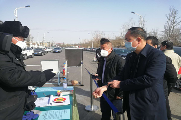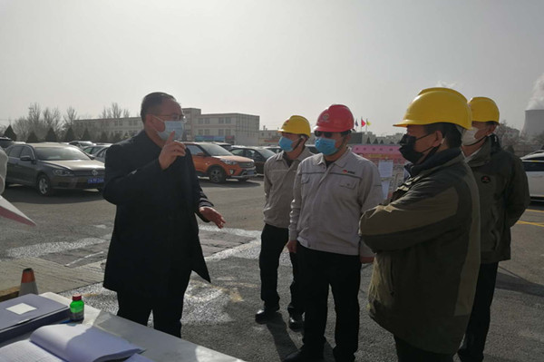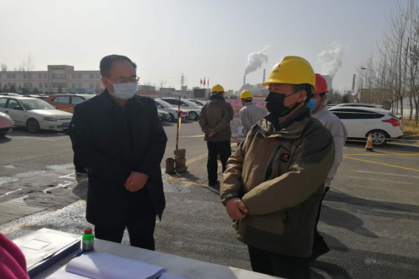 金永靈市長(zhǎng)按常規(guī)程序進(jìn)行測(cè)量體溫和登記信息,并翻閱出入大門人員信息登記臺(tái)賬。他詳細(xì)了解了集團(tuán)公司疫情防控工作,總裁葉森和黨委副書記兼工會(huì)主席王立軍逐一回答。