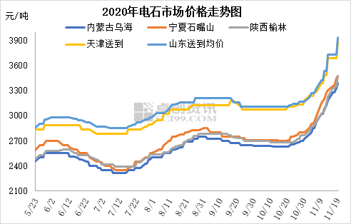 整體市場(chǎng)描述:上周五至今電石價(jià)格繼續(xù)快速上漲,各地采購(gòu)價(jià)連續(xù)上調(diào)300-400元/噸,電石出廠價(jià)上調(diào)200元/噸左右,且烏海及周邊貿(mào)易出廠價(jià)推出了明日繼續(xù)上漲100元/噸計(jì)劃。至此,10月下旬至今,電石價(jià)格已連續(xù)上調(diào)了700-800元/噸,達(dá)到2011年9月以來(lái)的最高水平。本周電石價(jià)格仍在繼續(xù)上調(diào),主要仍因供需失衡,貨源緊俏推動(dòng)。內(nèi)蒙古地區(qū)電石仍頻繁有不同程度的限電現(xiàn)象,產(chǎn)量不足,寧夏石嘴山地區(qū)受重污染天氣影響,本周后期有電石爐降負(fù)荷現(xiàn)象,外加其它復(fù)工電石爐恢復(fù)緩慢,電石增量較為有限;但PVC價(jià)格仍在連續(xù)上漲,前期停車PVC企業(yè)也有復(fù)產(chǎn),整體開工高位,部分甚至超負(fù)荷運(yùn)行,外加冬季來(lái)臨前對(duì)電石也有補(bǔ)庫(kù)需求,整體需求維持高位,綜合導(dǎo)致電石貨源持續(xù)緊張,價(jià)格得以連續(xù)上揚(yáng)。