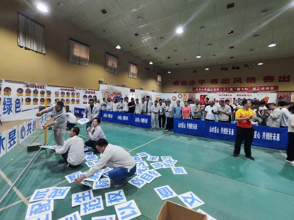 隨著裁判一聲令下,企業(yè)理念拼字比賽迎來激動人心的時刻。各參賽隊員不急不躁、有條不紊,大家集思廣益、默契配合,在最短時間內(nèi)準(zhǔn)確拼出“踐行綠色發(fā)展 留駐青山綠水”“山水昱心 共創(chuàng)好未來”“安全就是幸福 安全就是效益”等橫幅。